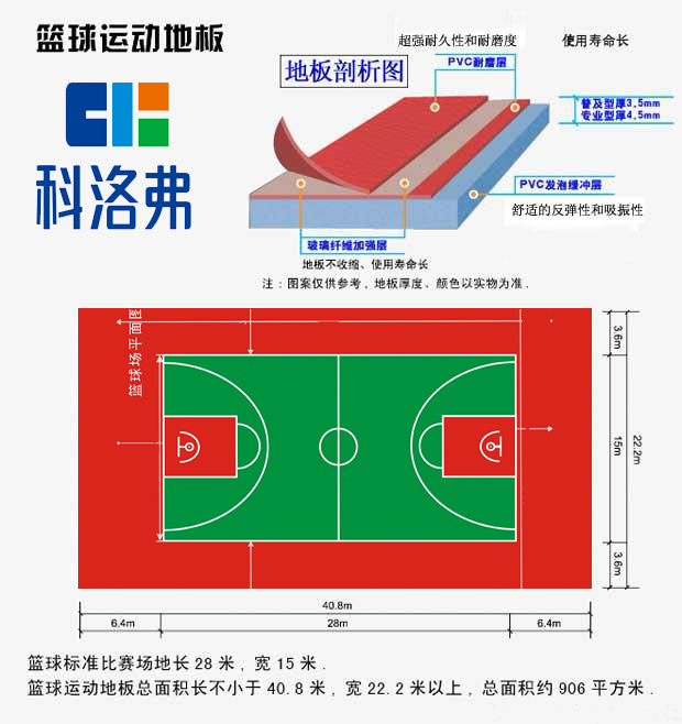 籃球運動起源于美國。籃球地板多使用10年至20年間的美國楓木地板鋪設而成,但是由于其造價昂貴,國內(nèi)多數(shù)場館均采用國產(chǎn)楓木地板鋪設。近年來,隨著塑膠地板技術進入我國和塑膠地板行業(yè)的興起,籃球塑膠運動地板在國內(nèi)已經(jīng)普遍被大眾所接受,因其良好的運動特性,深受廣大球員的喜愛?;@球塑膠運動地板在國內(nèi)還是一個新型的地板類型,具有很大的發(fā)展空間。籃球運動地板板材規(guī)格通覽: 單卷寬1.8m 卷長20m 面層紋理:楓木紋/寶石紋/布紋 總厚度:4.5mm/其他 場地線總長寬:28mX15m 地板總長寬:40mX20m 地板總面積:800㎡